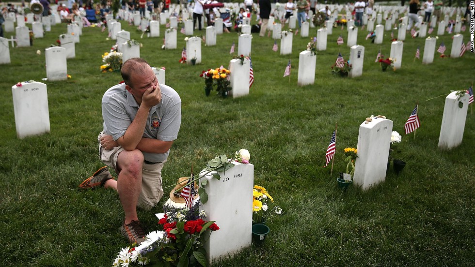ARLINGTON, VA – MAY 27: Alex Burgess gets emotional while visiting the gravesite of an old friend who was killed in Iraq, in section 60 at Arlington Cemetery, May 27, 2013 in Arlington, Virginia. (Photo by Mark Wilson/Getty Images)r3